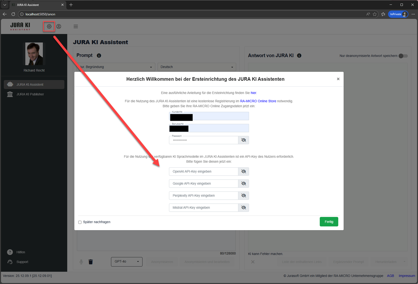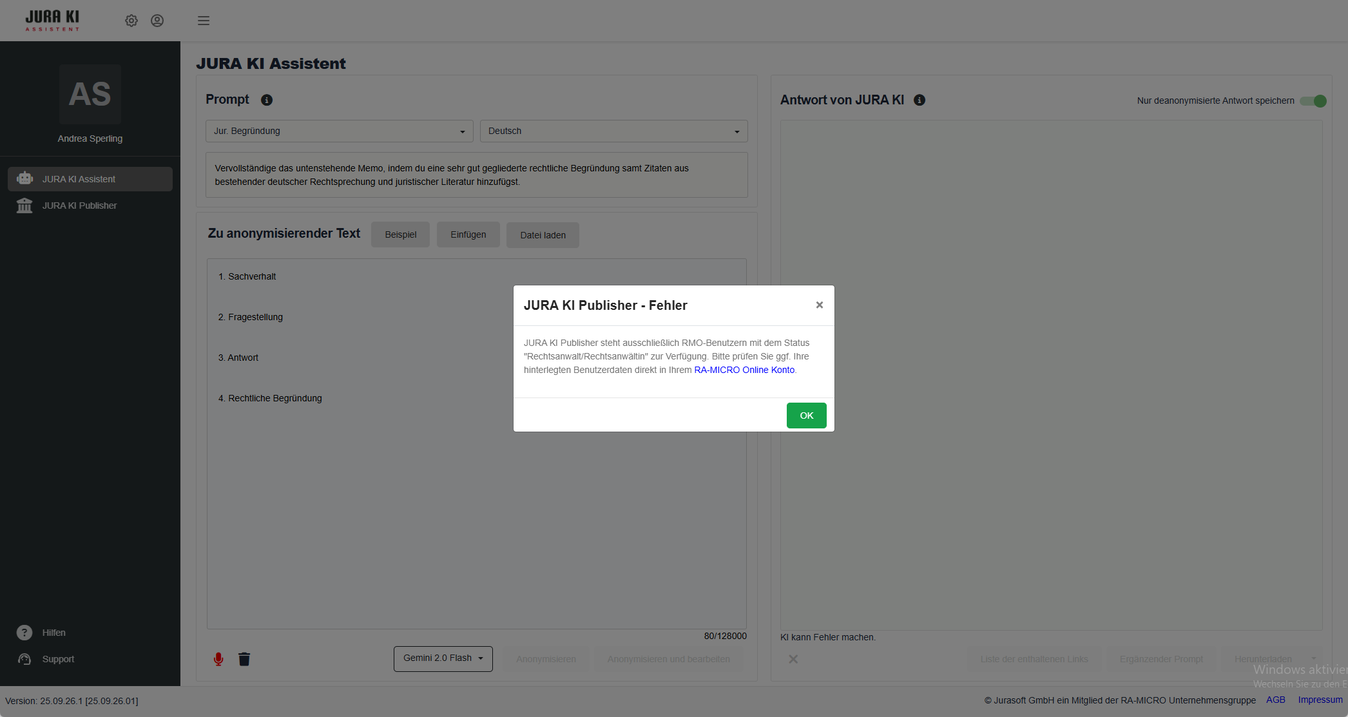 Beim ersten Start des JURA KI Assistenten erscheint eine Fehlermeldung und die Anwendung kann nicht genutzt werden.