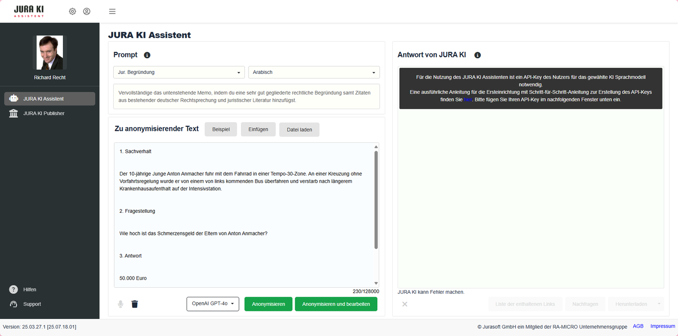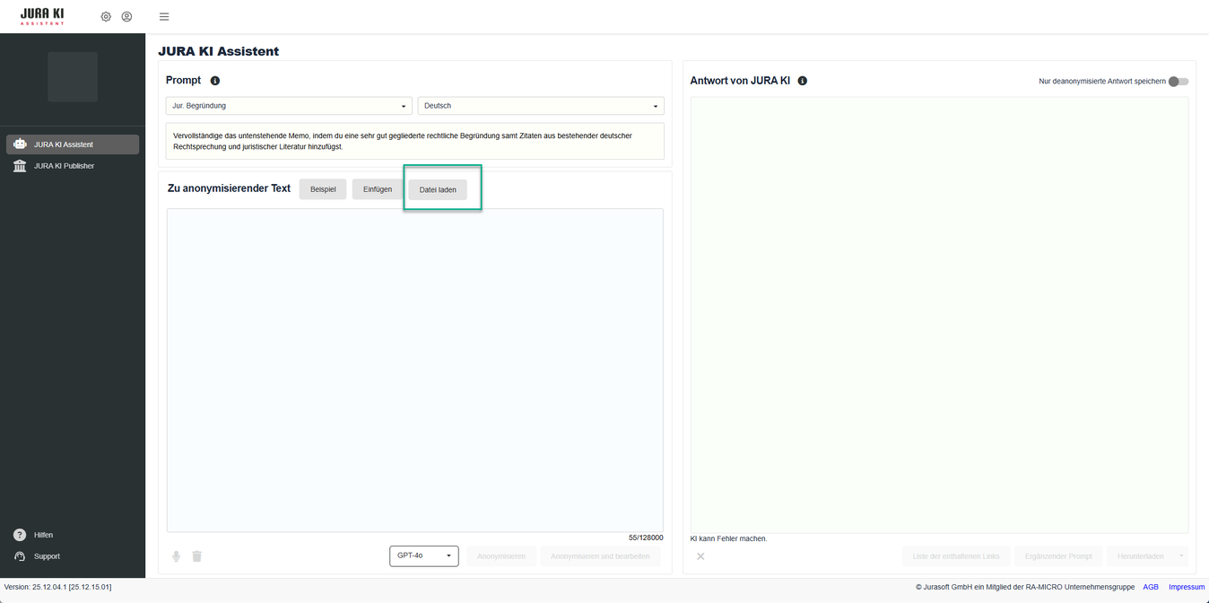 Die Anonymisierung erfolgt datenschutzkonform durch ein im JURA KI Assistenten integriertes, lokales KI-Modell automatisiert direkt auf Ihrem Gerät, ohne dass Daten an externe Server übermittelt oder dauerhaft gespeichert werden.