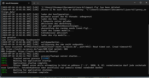 Nach dem Neustart Ihres Computers und dem Versuch, den JURA KI Assistenten zu öffnen, erscheint eine Fehlermeldung in der Konsole und der Start wird abgebrochen.